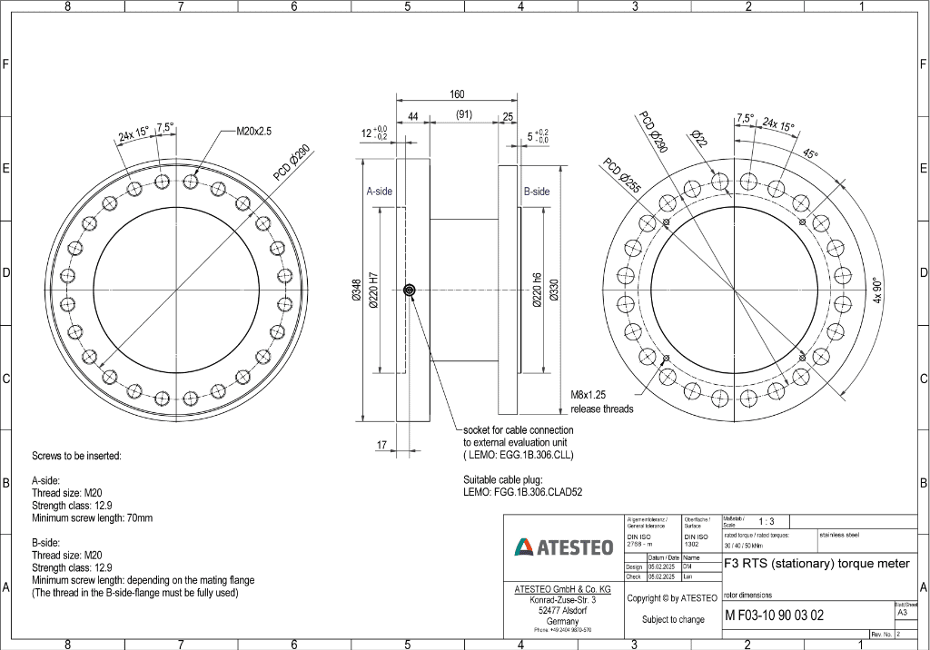 El Transductor de par F3 RTS es un sensor estático (de reacción) diseñado específicamente para aplicaciones de altísimo par (Heavy Duty), cubriendo rangos desde 30 kNm hasta 50 kNm. A diferencia de los sensores rotativos, el F3 RTS está concebido para medir el par de reacción en carcasas, bancadas o sistemas de freno bloqueados, ofreciendo una rigidez estructural excepcional.